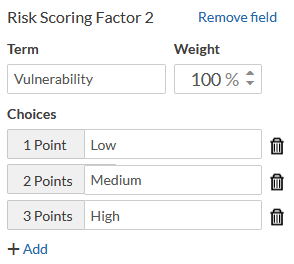 You notice that the risk scoring factors for Impact, Likelihood, and Velocity are already set up for you. Your organization also evaluates risk on Vulnerability using a three-point scale, so you need to set up one more risk scoring factor as part of your risk scoring framework.