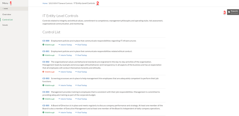 Allows you to access the Control List page and specific Walkthrough or Testing phases. |