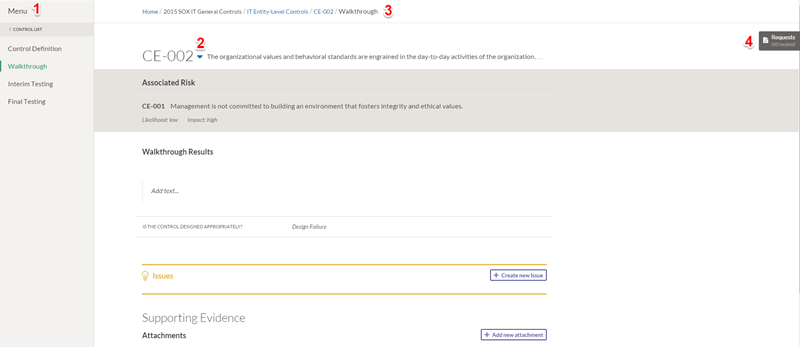 Once you have drilled into a specific Control, (either by clicking the Control Reference Number or specific Walkthrough or Testing phase from the Control List page), the Control page opens.