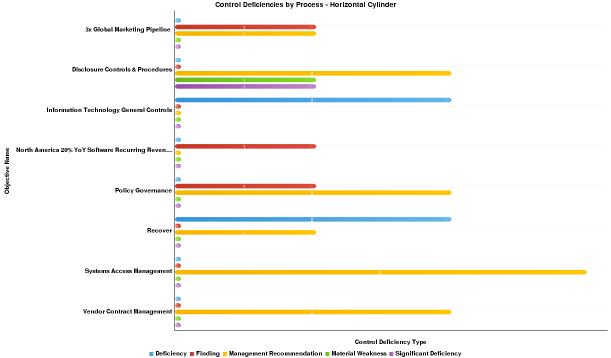 You need to visualize your findings that pertain to control deficiencies by process. Using a horizontal cylinder chart, you visualize each process and clearly demonstrate the associated control deficiency information: