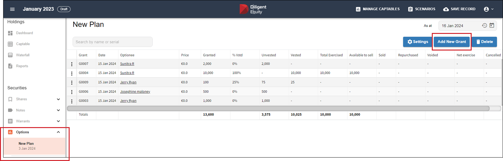 There are two stages to creating Grants for an option plan in Diligent Equity. Create or add a shareholder and create the Option Grant or Stock Award. This is all done through the same new grant wizard.