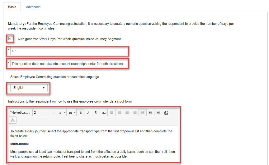 In the Basic tab, enter the question number of the earlier question 'How many days per week on average do you normally commute to the selected office?', any additional instructions or explanatory text for the respondent, and select from a choice of four languages, English, Portuguese, Spanish and French.