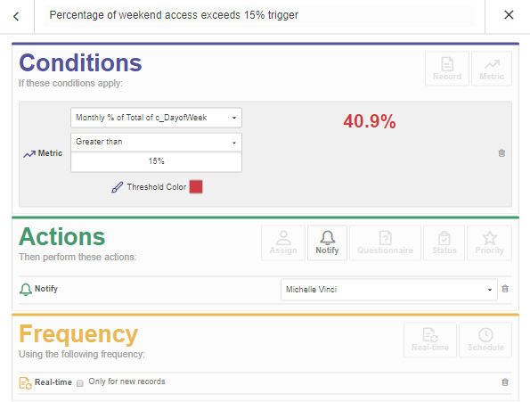 Para monitorear mensualmente el porcentaje total de acceso a las instalaciones en fin de semana, crea una medida en Resultados y configura un disparador para que se le notifique cuando la medida excede el umbral del 15 %. Luego enlaza la medida con el riesgo de fórmula del látex en Estrategia.