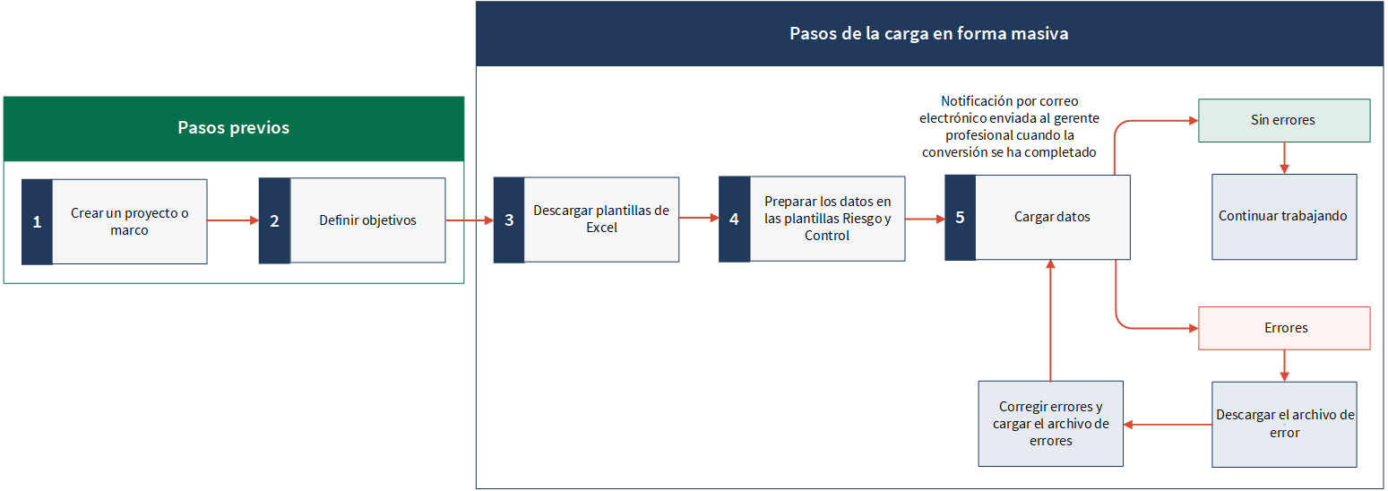 La carga en forma masiva solo incluye la adición de riesgos y controles a un proyecto o marco. Una vez que se haya completado la carga en forma masiva, aún debe asociar los riesgos y los controles.