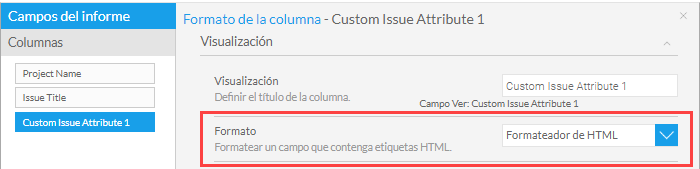 Su reporte contiene una serie de atributos de asuntos personalizados de la aplicación Proyectos. Algunos de estos atributos de asuntos personalizados son campos de párrafos (texto enriquecido).