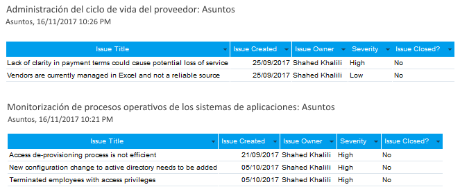 Tiene dos reportes que contienen datos de los asuntos detallados asociados con dos proyectos: