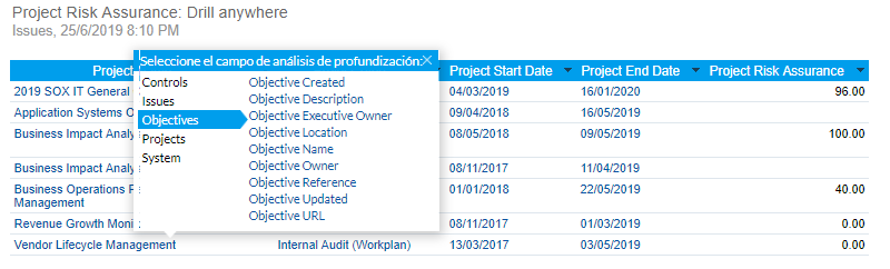 Los lectores de reportes pueden acceder a datos de asuntos que pertenecen a diferentes proyectos. Algunas posibles rutas de profundización que sus lectores de reportes pueden tomar incluyen: