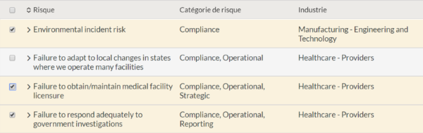 - Sélectionnez les risques que vous souhaitez importer dans votre profil du risque organisationnel, ou cochez la case en regard de l'en-tête Risque pour sélectionner tous les risques de la liste.Astuce