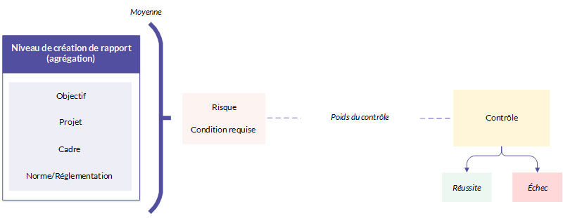 D'abord, vous créez des relations entre les risques / conditions requises et les contrôles et précisez le poids du contrôle afin d'indiquer le pourcentage du risque ou de la condition requise que le contrôle réduit. Puis, vous réalisez des revues générales et des tests afin d'enregistrer la réussite ou l'échec des contrôles.