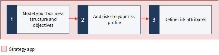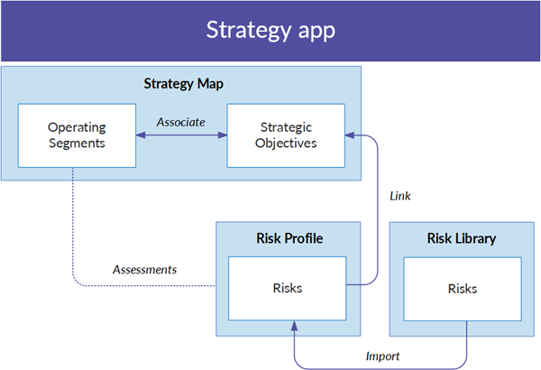 All'interno della Mappa della strategia, è possibile associare segmenti di operazione e obiettivi strategici. All'interno del Profilo del rischio, è possibile collegare i rischi agli obiettivi strategici definiti nella Mappa della strategia per valutare il rischio e visualizzare le aggregazioni di rischio.