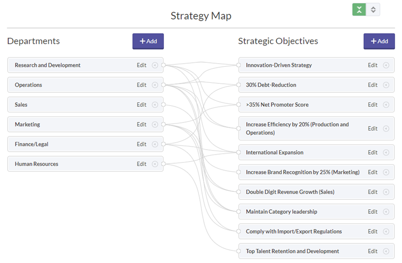 Quindi, utilizzando il rapporto 10-K dell'organizzazione (Vandelay), aggiungi i dipartimenti e gli obiettivi strategici dell'organizzazione alla Mappa della strategia e associ i dipartimenti ai relativi obiettivi strategici.