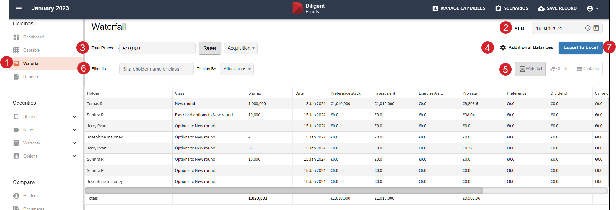 Here we look at your C corp Waterfall view and its features. If your company is set up as an LLC you will have additional features. For more information, go to About Limited Liability Company waterfall.