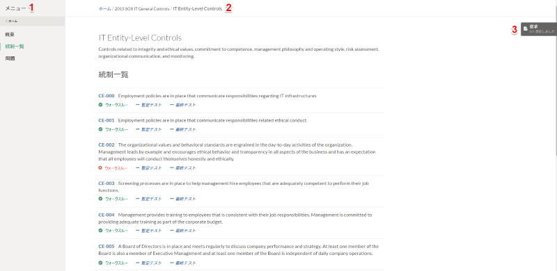 [統制一覧]ページと、特定のウォークスルー、またはテスト フェーズにアクセスできます。 |
