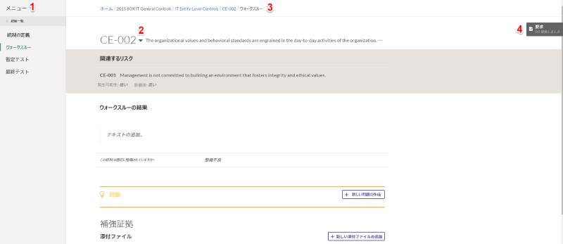 | 4 | [要求]サイド タブ | 特定の統制に関連する要求にアクセスできます。 |