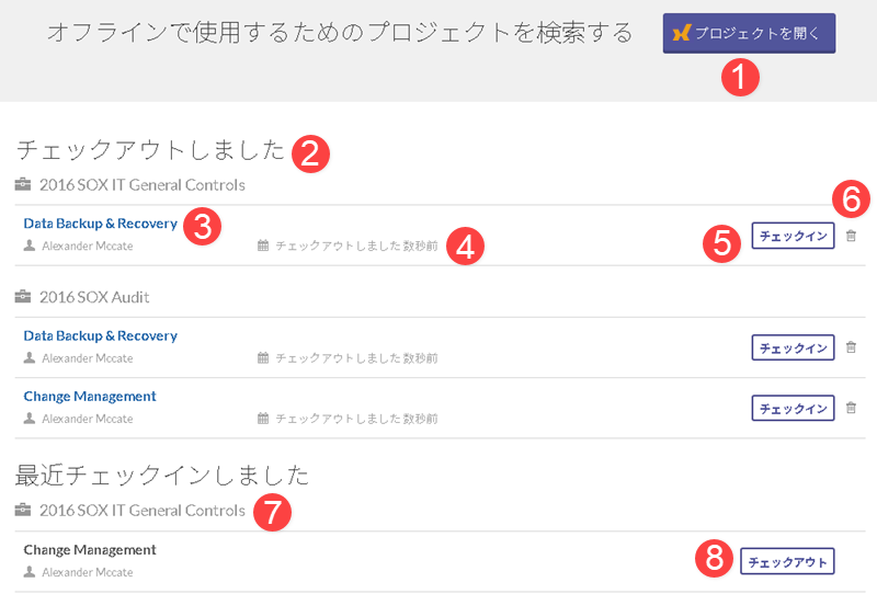最近チェックインされたセクションの一覧にアクセスします。 この領域を使用すると、セクションを検索せずに簡単にチェックアウトすることができます。セクション名、 プロジェクト名、セクションに割り当てられているユーザー、およびセクションがチェックアウトされた日付が表示されます。 |