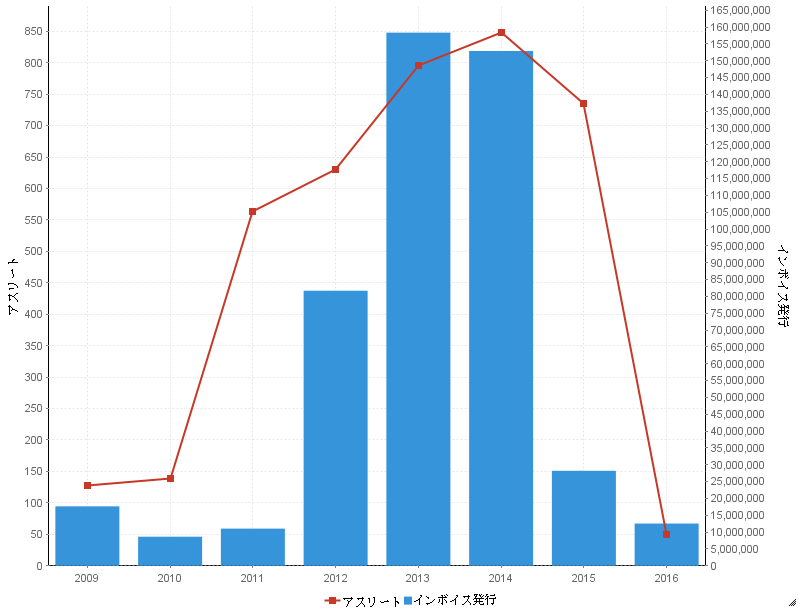 スポーツ関連組織は、ある期間にわたりアスリートに請求されたデータを追跡しています。コンビネーショングラフを使用してアスリートの人数を視覚化し、ある期間にわたり年間で請求された金額を示します。
