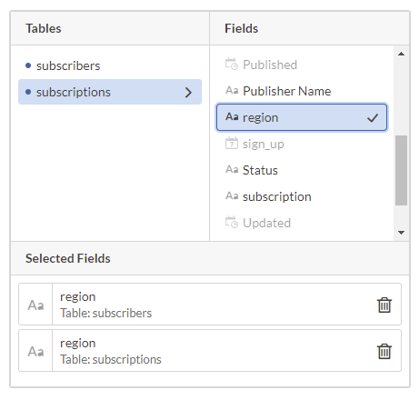 - [テーブル]リストから、テーブルを選択し、[フィールド]リストから、フィルターをオンにするフィールドを選択します。