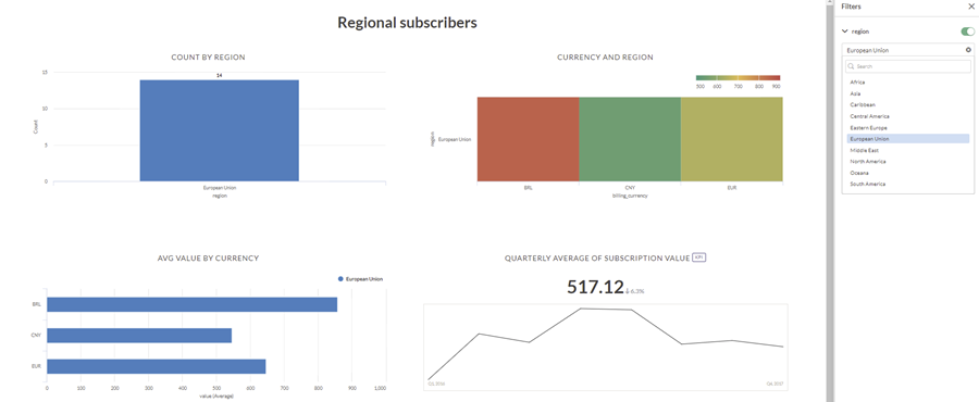 あなたは、2 つのテーブル、サブスクライバーとサブスクリプションからのデータを使用するストーリーボードを作成します。各テーブルは、地域と呼ばれるフィールドを含んでいます。ストーリーボードと 1 つのメトリクスに、3 つのグラフがあります。