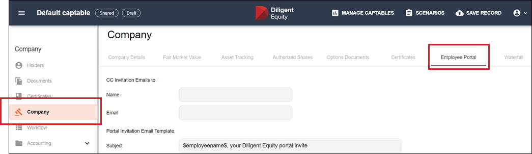 • Default Subject Line: $employeename$, your Diligent Equity portal invite