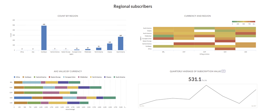 U maakt een storyboard dat gegevens gebruikt uit twee tabellen: subscribers en subscriptions. Elke tabel bevat een veld met de naam region. Er zijn drie grafieken op het storyboard en één metriek: