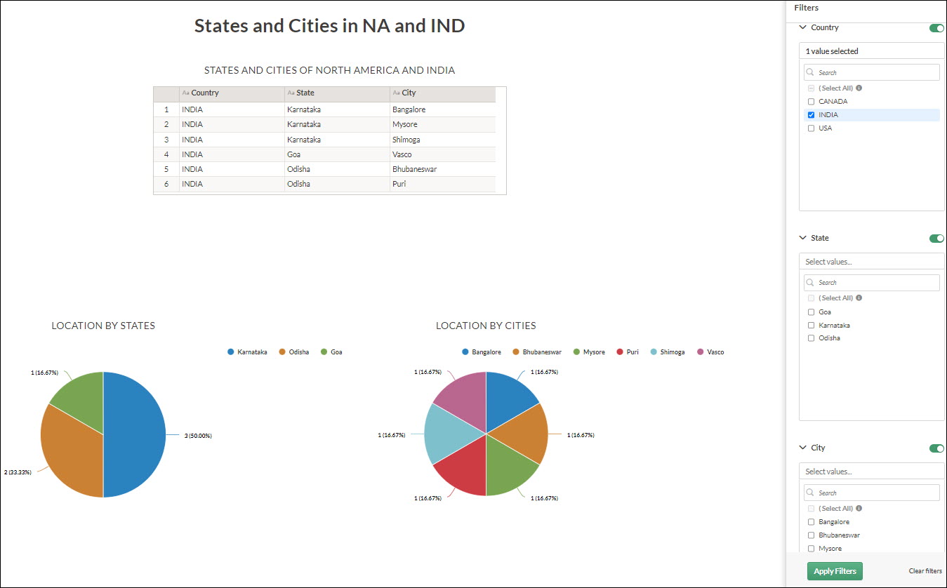 Bijvoorbeeld: In de bovenstaande afbeelding, wanneer u Karnataka selecteert in het filter Staat en op Filters toepassen klikt, blijven in het filter Stad de waarden Bangalore, Mysore en Shimoga behouden en worden de overige waarden (die bij andere staten horen) gewist. Ook USA en Canada worden uit het Land-filter verwijderd.