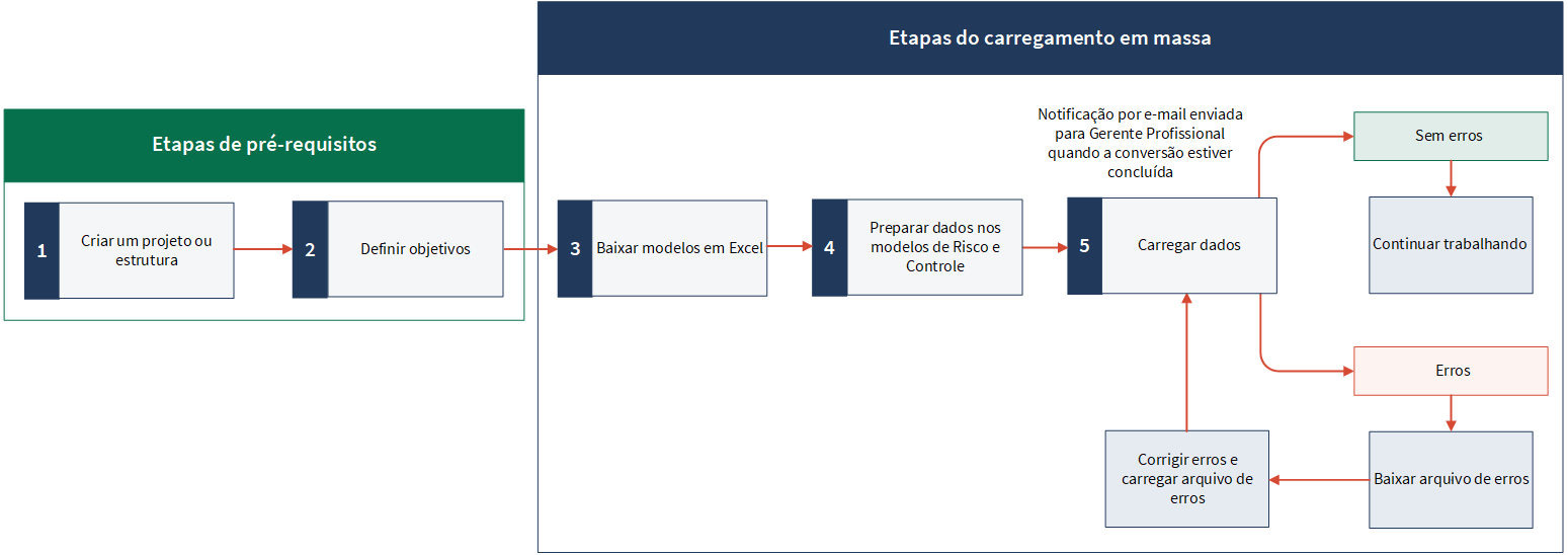 O carregamento em massa inclui apenas a adição de riscos e controles a um projeto ou estrutura. Quando o carregamento em massa estiver completo, você precisará associar os riscos e os controles.