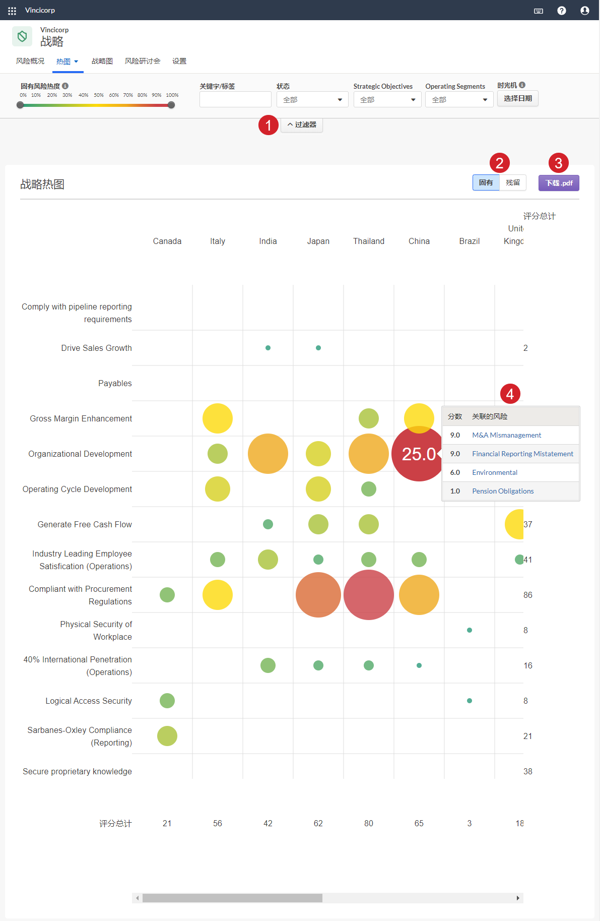 战略热图标识贵公司中风险聚类的位置。它显示了贵公司各个领域中的风险聚合,指示您应该在何处聚焦您的缓解措施。战略热图可以显示固有的或者残留的风险,但不能同时显示两者。只有一个战略热图,并且您不能删除它。